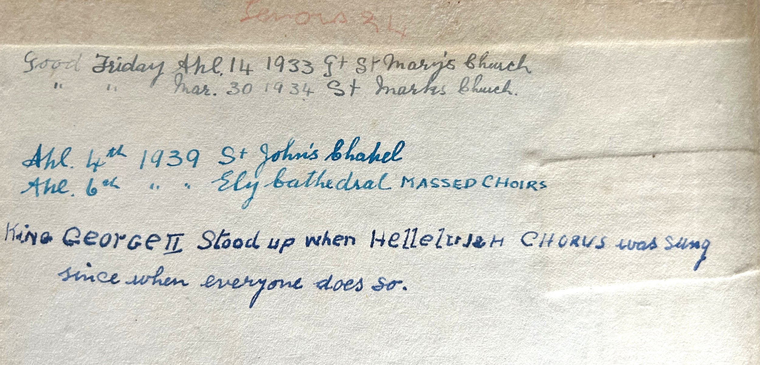 Among the books was his copy of Handel’s Messiah with notations of the dates he performed including the performance of “massed choirs” at Ely Cathedral on April 6th, 1939. There were pictures of him including one standing in a spectacular ‘Corridor’ of plants in Cambridge. He also kept a note signed by Baden Powell, the founder of the Boy Scouts, thanking him for his efforts.