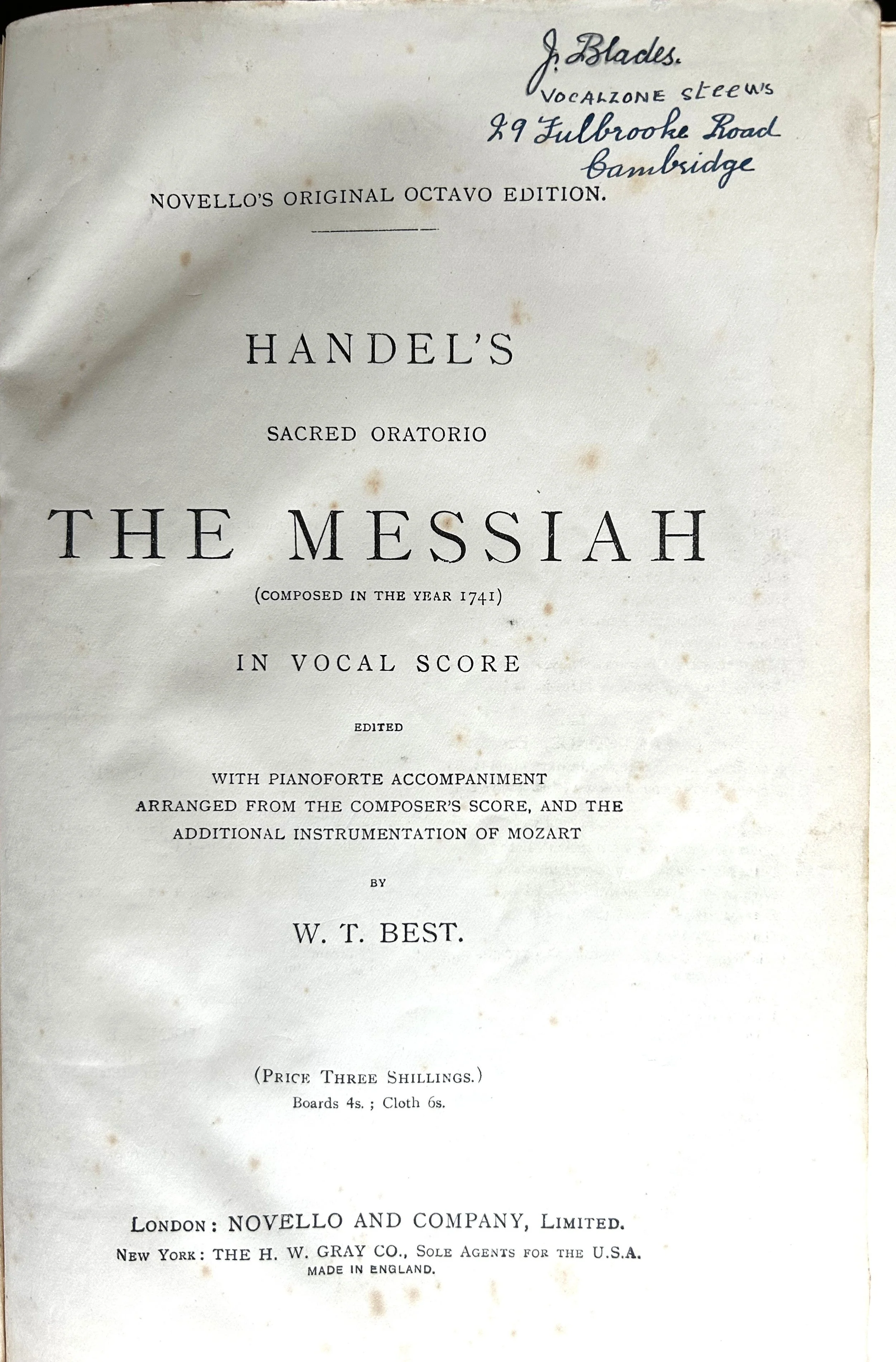 Mr. Blades’s notes written on the inside cover of his copy of ‘The Messiah’